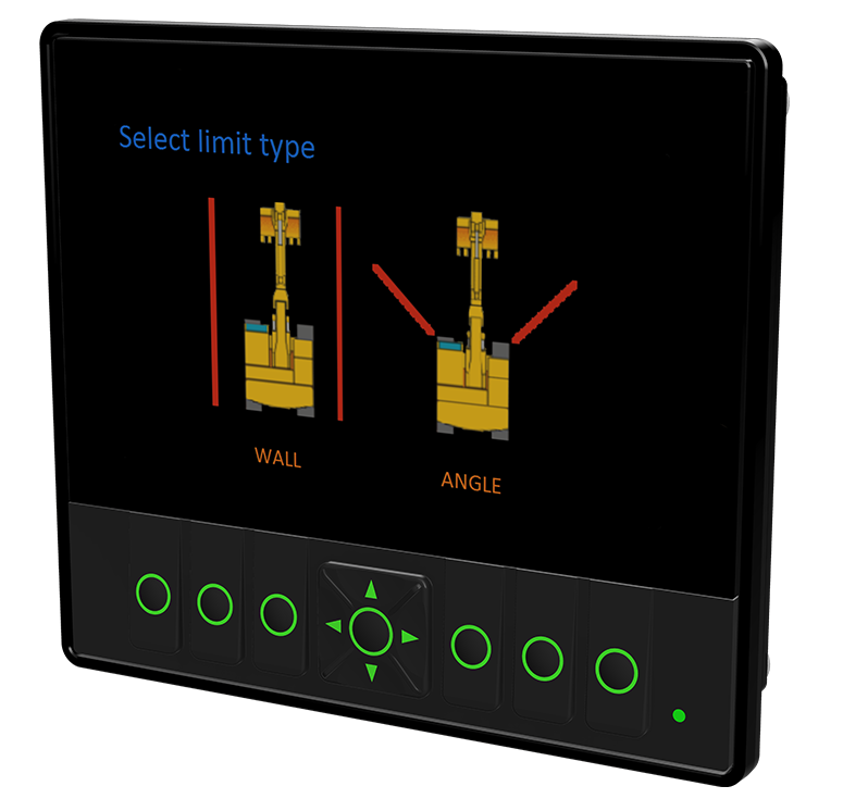 Single/dual parallel wall or angular limitation are available. When walls are in use, the front end equipment is also monitored and controlled for limit breach. Limits can be either manually keyed in or set by positioning the machine. If both limits are active, the system will automatically flip to the appropriate display should a hazard approach occur. Set up is simple, quick, and can be protected with an optional access key switch. All settings are retained and will be active on start-up.